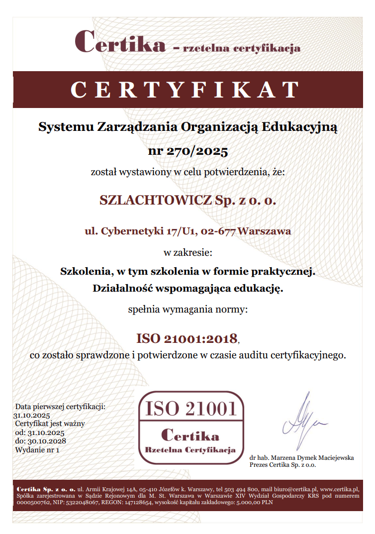 Oznacza to, że nasze szkolenia są prowadzone zgodnie z najwyższymi standardami jakości, transparentności oraz bezpieczeństwa. Certyfikat gwarantuje, że każdy kursant otrzymuje rzetelną, profesjonalną wiedzę oraz wsparcie na każdym etapie nauki, a proces szkoleniowy jest stale udoskonalany, by spełniać oczekiwania branży i uczestników.